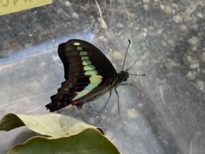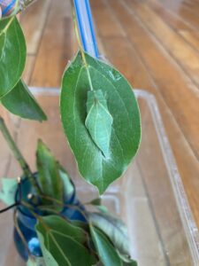 すぐにサナギになりました。いつも飼育しているアゲハ蝶と違い、葉っぱでサナギになるため葉脈のような模様ができるんだなぁと、子どもよりも先生が興奮ぎみでした。そして無事にちょうちょに。