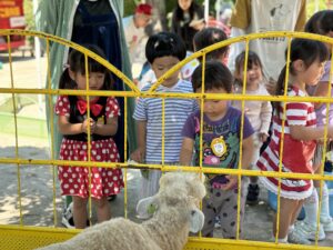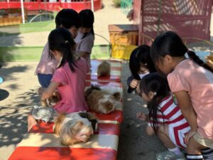 この日の幼稚園は朝からワクワク。大きな赤いトラックに乗って、沢山の動物たちが遊びに来てくれました。いちご動物園の動物たちです。