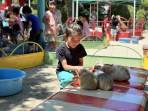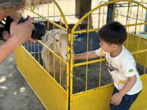 動物たちと仲良くする方法をお兄さんから聞いていよいよふれあいタイムです。モルモット、うさぎ、ヤギ、ポニー、羊、亀、犬と沢山の動物たちと仲良くなれるかな?