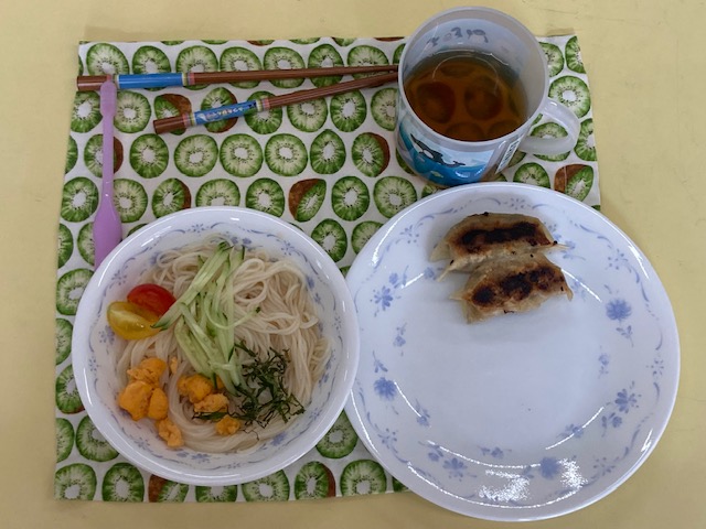 9月はトッピングそうめん!みんなが好きなそうめんの上に色々なおかずをトッピングして食べました。