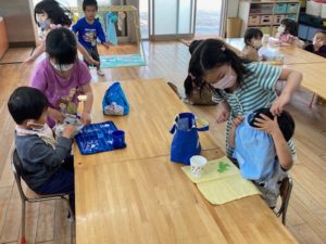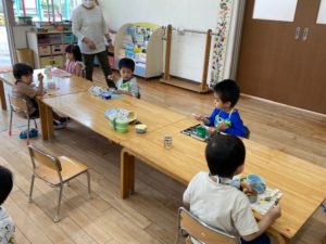 今日からほし組さんもお弁当が始まりました!みんなが楽しみにしていたお弁当。準備をあい組さんがまたまた手伝ってくれました。