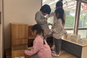 ちょっと座りながら紐を巻いて、しりとりもしています。