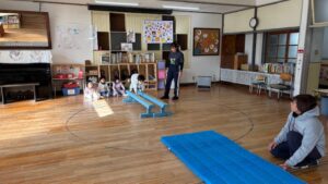 いろんな動きをして跳び箱や平均台も使うことができ、ドキドキしながらもとても楽しそうな表情でフィットネスに取り組んでいる姿が見られました!!
