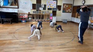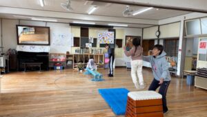 そしてみんなの楽しみにしていた平均台と跳び箱が登場しました。平均台はライオンの動きで落ちないように進みます。跳び箱は上に乗ってリーダーの手にタッチしながらジャンプしました。最初は跳ぶのが怖く手を繋いでいた子も2回目には1人でジャンプできていました✨