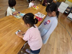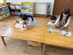 お昼の支度のやり方を聞いて、あいぐみさんに手伝ってもらいながらお弁当の準備をしました!