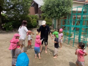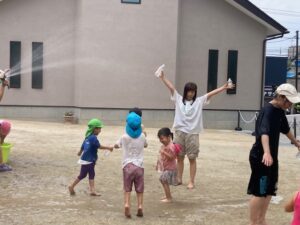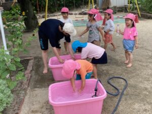 今日も暑いので、みんなで水遊びをしました。ペットボトルに水を入れてかけ合いっこをしました。
