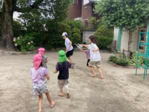 子ども同士もかけ合いますが、特に先生たちは集中攻撃を受けてびっしょびしょ。そんな時子どもたちはとても良い(悪い?)顔をしています。