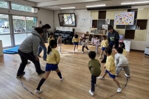 やがじいさんは、幼稚園の畑でお野菜作りもしてくれています。畑のお仕事が終わった後、一緒にころがしドッチもやってくれました。「キャーキャー!すごーい!」と言う声がいっぱいの楽しい一日でした。