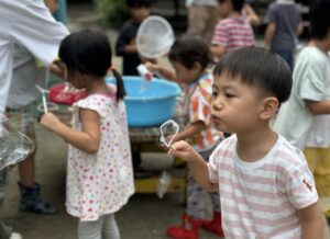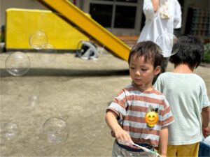 いよいよシャボン玉パーティー開始!お家から大きなシャボン玉を作る為のグッズをいろいろ持ってきた子もいます。それぞれに楽しんでいました。手を使ってシャボン玉をしている子もたいました。シャボン玉がいっぱいできて楽しい一日でした。