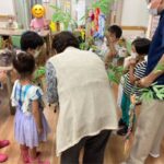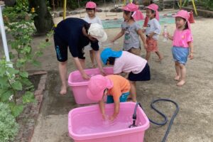 今日はみんなでシャボン玉パーティーです。シャボン玉の液もみんなで作ります。(水100ml、洗剤50ml、洗濯糊10ml、ガムシロップ5ml)を混ぜます。なるべくそつと。