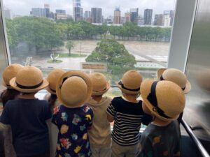 遂に科学館に入館です。プラネタリウムのあるところまでエレベーターで上がります。外が見えてまた、テンションアップ!