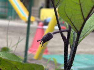植えたばかりの頃カラスにイタズラされてしまったので、今朝までネットの中で育っていた夏野菜のネットを外すと子ども達は興味津々です。花を見つけたり、匂いを嗅いでみたりしています。