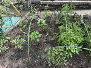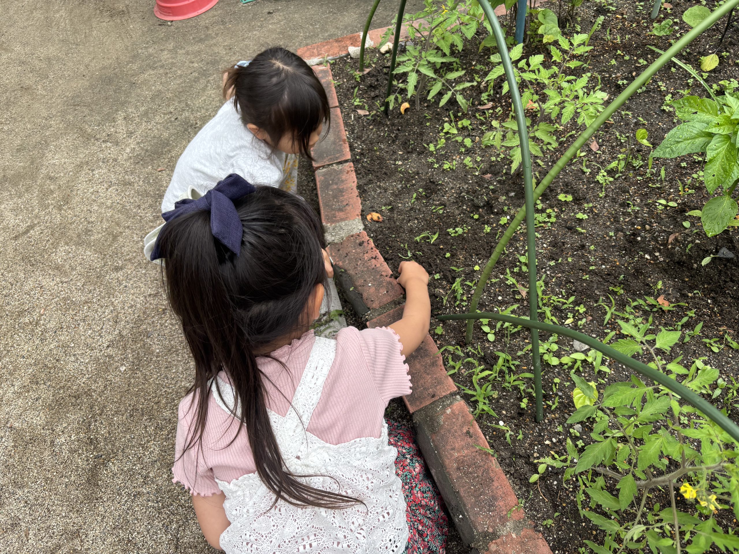 ネットに守られていたので、気がつけば草もいっぱい生えています。年長さんが草抜きを手伝ってくれました。「なんで抜いちゃうの?」「これアリじゃないよね。なんだろ」「めっちゃ大きいダンゴ虫いたよ」「トマトのにおいすごくするね」「早く食べたいね」などなど、椅子に腰掛けながら、話に花を咲かせ、畑の整備をしてました。こんなに綺麗になりました。