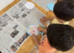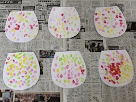 絵の具を使って自分の指でスタンプしてジュースを作ります。「赤はいちごかなぁー?」「トマトも入れた!」「メロンやキウイも入ってるよ!」とみんな色からいろんなフルーツを想像してジュースを作っていました!