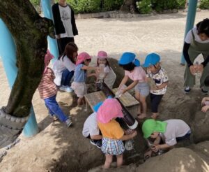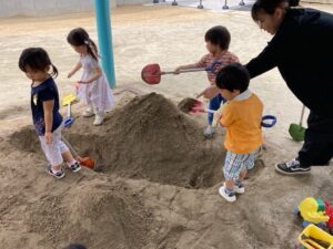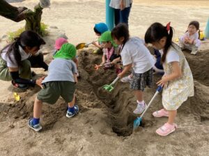 今日は久しぶりに天気が良かったので、砂場で穴を掘っているとみんなが集まってきました。星組さんは先生も一緒にながーい穴を掘りました。