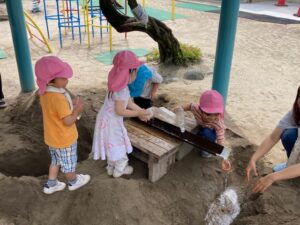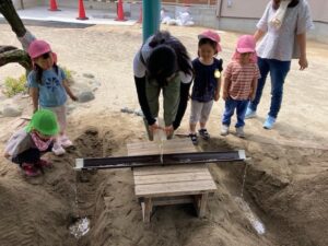 穴も山も完成!その後はやっぱり穴に水を入れなきゃね。穴と穴を繋げるために今日は先生が特別な道具を持ってきてくれました。をんなでワクワクしながら見ています。