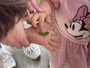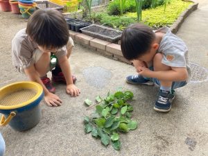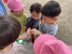 幼虫たちの餌になるアブラムシもいっぱいいました。ブランコの横のキンカンの木にはアゲハ蝶の幼虫がいっぱい。みんなで触ったり、手にのせたりしました。星組さんもみんなが触っているのを見て、ちょっとドキドキしながらも指先でチョンと触れて喜んでいました。