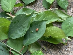 裏の梅の木にてんとう虫の卵や幼虫、蛹を見つけました。少し枝を切って観察しました。