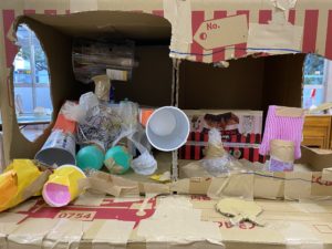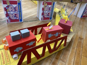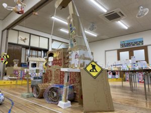 次はトッラッククレーンです。重い荷物を持ち上げています。タイヤは子どもたちがダンボールを巻いて、それから飾りを付けました。力作です。アウトリガーも付けてあるので倒れません。運転手さんもがんばっています。工事中の看板もあります。