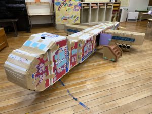 空には飛行機やヘリコプターが飛んでいます。みんながお家から持ってきてくれたいろんな箱が大活躍です。