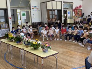 幼稚園のみんなで花の日のお礼拝をしました。みんなが家から持って来てくれたお花を、お手伝いのお母さん達が綺麗にアレンジしてくれました。それを飾って「かみさま、きれいなお花をありがとう」とお礼拝しました。