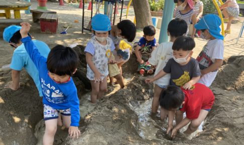 今日はとーっても暑いので、お砂場をプールにしようとはりきって穴を掘りました。そして、ここにペットボトルで水を運び入れます。トンネルを掘った所から入れたりもします。水が沢山になってきたので、次は自分たちが入ってしまいまし…