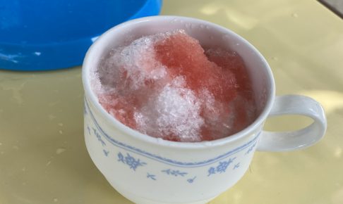 「今日は暑いねぇ〜」という事で、『かき氷』を食べることにしました。お庭に椅子を並べて、いちごとメロンとブルーハワイとみぞれの中から好きな味を選んで食べました。少し涼しくなって、とっても美味しかったです。 ちなみに、はじめ…