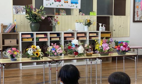 幼稚園のみんなで花の日のお礼拝をしました。みんなが家から持って来てくれたお花を、お手伝いのお母さん達が綺麗にアレンジしてくれました。それを飾って「かみさま、きれいなお花をありがとう」とお礼拝しました。 そのお花をのぞみ組…