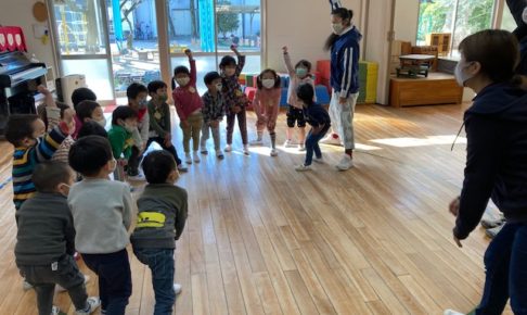 星組の子供たちが楽しみにしていたフィットネス体験の日がやってきました!いつもはのぞみ組さんやあい組さんのフィットネスの様子をドアの所から見ているだけですが、今日は違います。 まずはみんな丸くなったら、手を離さないように大…