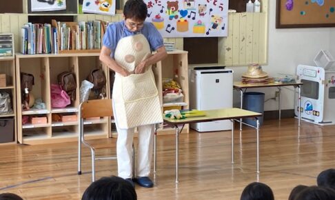 今月も西村さんが読み聞かせに来て下さいました。 今日は♪ポーケットの中にはビスケットが1つ♪と歌に合わせてエプロンシアターから始まりました。 それから季節に合った手遊びやわらべうたの手遊びも。 今日の絵本は「もこもこもこ…