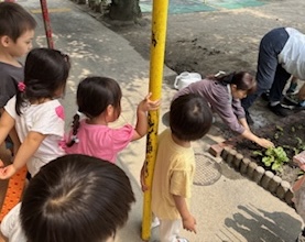 前に子どもたちが植えてくれた花の種がたくさん芽を出したのでより育つように花壇に移しました。 園庭がとても暑かったので子どもたちはできませんでしたが先生たちを見て応援していました! 自分たちが種を植えたことを思い返しながら…