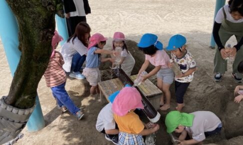 今日は久しぶりに天気が良かったので、砂場で穴を掘っているとみんなが集まってきました。星組さんは先生も一緒にながーい穴を掘りました。 その隣ではのぞみ組とあい組さんが自分たちで長くて星組さんより深い穴を掘っていました。 穴…