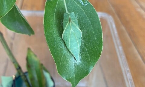 6月の初めに頃、砂場の水色の柱にあおすじあげはの幼虫を見つけました。あおすじあげははくすの木の葉っぱに卵を生みます。なのでなかなか出会えないのです。せっかくなので観察したい!と思い、飼育箱に移動しました。 すぐにサナギに…
