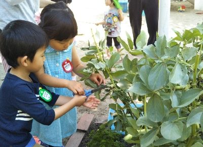 園庭のお豆が大きくなって来ました。そら豆とグリーンピース。 お昼には おいしい!(๑´ڡ`๑) そしてグリーンピースも 小さいおにぎりにしてもらい、お弁当の時にいただきました。