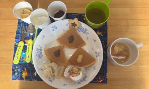 1か月に一度、おにぎりを持って来るとおかずは幼稚園で作ってもらえる日が「おにぎりの日」です。そのおにぎりの日のクリスマススペシャルバージョンという事で、今回のメニューはホットケーキです。上の紙コップの中には、クリームとロ…