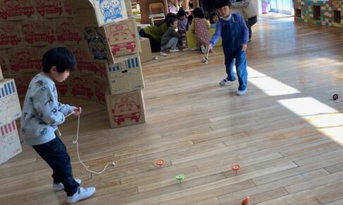 最近子どもたちがコマを回す練習をしています。今日は午前中、あい組の子どもたちの数人が20個のコマを同時に回すチャレンジをして盛り上がっていました。先生たちも巻き込みましたが結果は残念。午後からは他のあい組の子もやってきて…