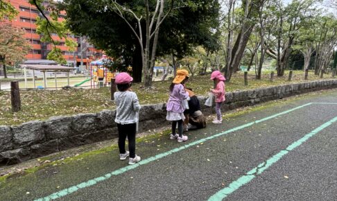秋になってきました。公園にはきっとどんぐりが落ちているに違いない!!という事で、のぞみ組さんは神宮公園にお散歩に行く事にしました。 おかえりのコースの白コースの道を通りながら、公園まで歩いて行きました。途中の道で、タンク…