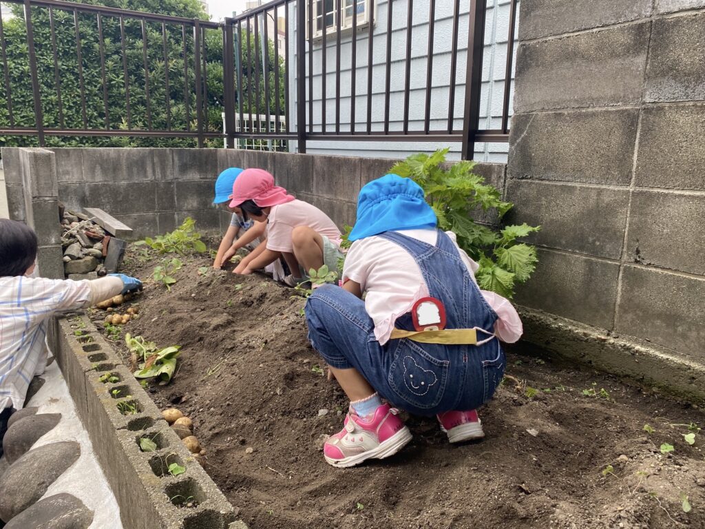 園庭の小さな畑に種を蒔き、苗を植えて野菜を子どもたちといっしょに育てます。