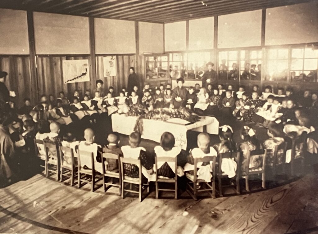 堅磐信誠幼稚園は1897年(明治30年)にA, L, コーツ宣教師によって開設された『潅園保育所』を源としています。民家を借用し、10名くらいの園児でした。